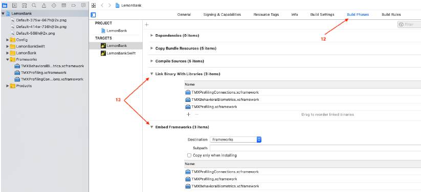 In the “Frameworks, Libraries and Embedded Content” section, make sure that the following files are added: TMXProfiling.xcframework, and TMXProfilingConnections.xcframework.