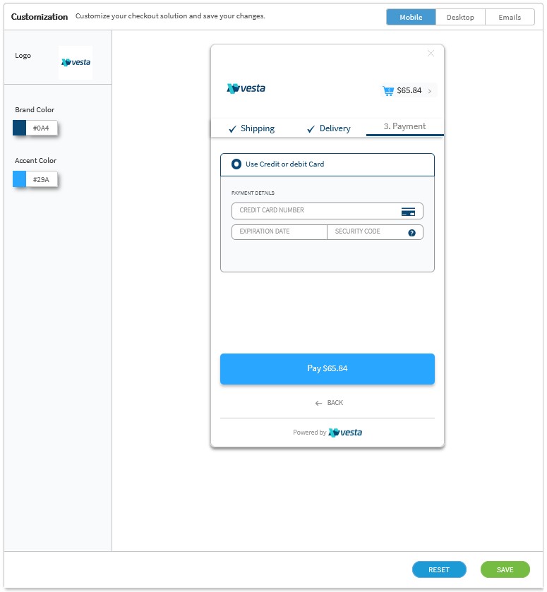 In the Customization section, shown below, define the appearance of the payment form for mobile and desktop screens and the receipt that Vesta generates for each transaction: