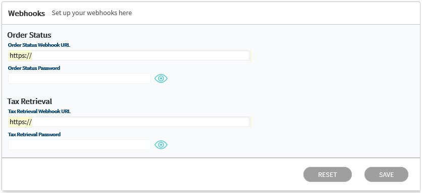 - Tax Retrieval Webhook URL - This is the URL that Vesta will use to retrieve the updated tax information from the merchant if the customer changes the billing address country or state/region.
